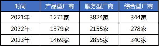 从过去两年来看,国内综合型厂商数量基本恢复到2021年的水平,产品型厂商数量近两年持续上升,对比2021年增长15.6%,但服务型厂商数量对比2021年,仍下降25.3%。
