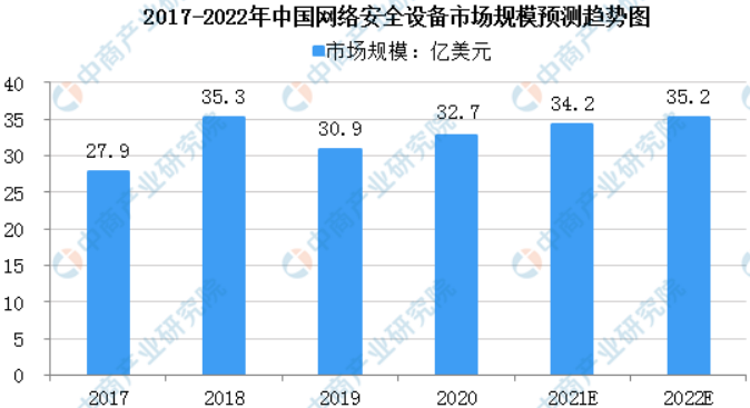 数据显示,2017-2020年,中国网络安全设备市场呈波动上升趋势,2018年市场规模达到最大,为35.3亿美元,2020年为32.7亿美元,同比上升6.1%。中商产业研究院预计2022年中国网络安全设备市场规模将达35.2亿美元。