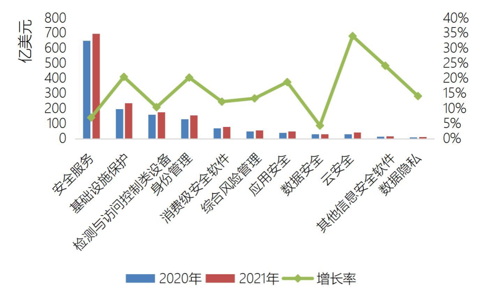 安全服务方面,2021年全球网络安全服务市场规模达到696.5亿美元,同比增长7%,主要包括安全咨询、安全外包及托管、安全实施和硬件支持四大类。