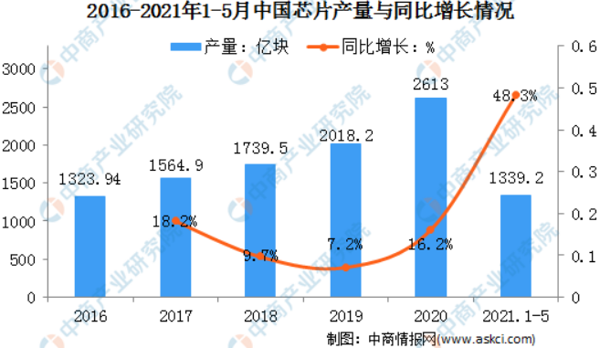 芯片是半导体元件产品的统称。是集成电路的载体,由晶圆分割而成。我们可以将芯片划分为功能芯片和存储芯片。数据显示,截至2021年1-5月我国芯片产量为1,339.2亿块,同比增长48.3%。