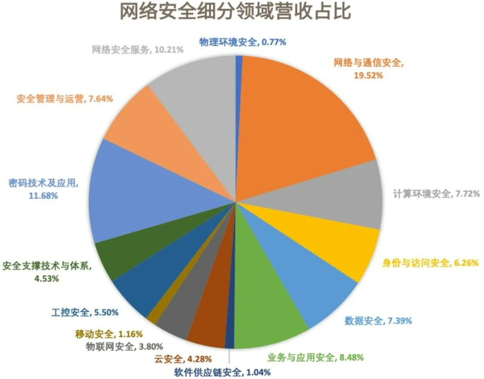 根据第十版全景图一级领域划分,结合网络安全企业细分项收入数据统计,市场占比排名最高的细分领域为网络与通信安全(19.52%),其次分别是密码技术及应用(11.68%)****、网络安全服务(10.21%)。本文将重点就这三个细分领域展开分析。