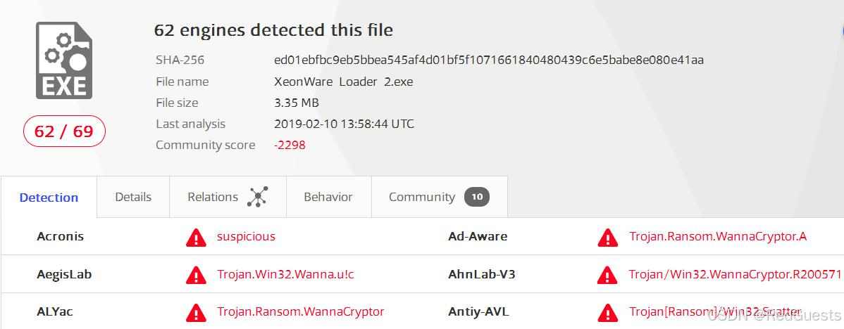 一个用来分析恶意程序的网站,通过上传一个文件,生成该程序的分析报告,下图所示为wcry.exe的分析报告 头部信息