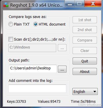 Regshot是一款开源的注册表工具,通过比较两个注册表快照发现差异,从而得知程序运行后对注册表实施了 哪些行为