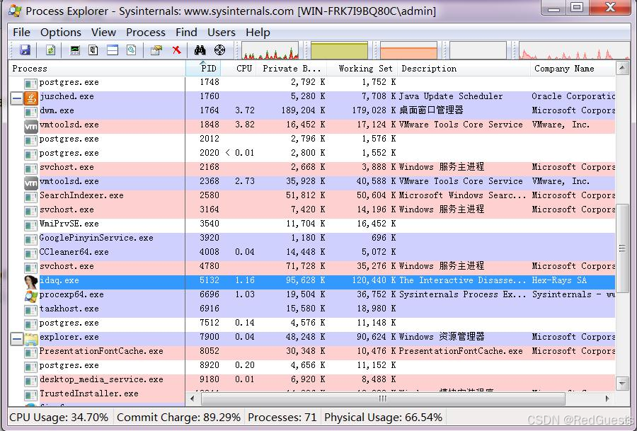 进程浏览器(Process Explorer)是一款强大的任务管理器,是进行动态分析时的必备工具,它能对当前系 统上运行的进程提供有用的观察能力