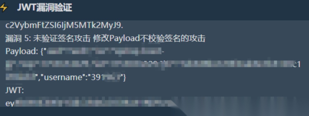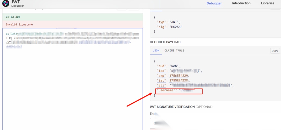 接着来解密下JWT,发现Payload字段有一个username参数,有越权的可能性。但还需要解决JWT签名检验问题,不然改了Payload也无意义。