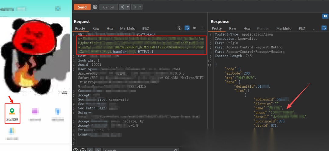 点击地址管理,替换JWT,也能越权查询其他人的地址信息。
