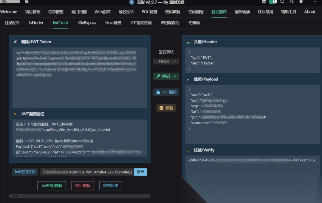 还有其他JWT漏扫工具,但是还是比较推荐无影Tscanplus: