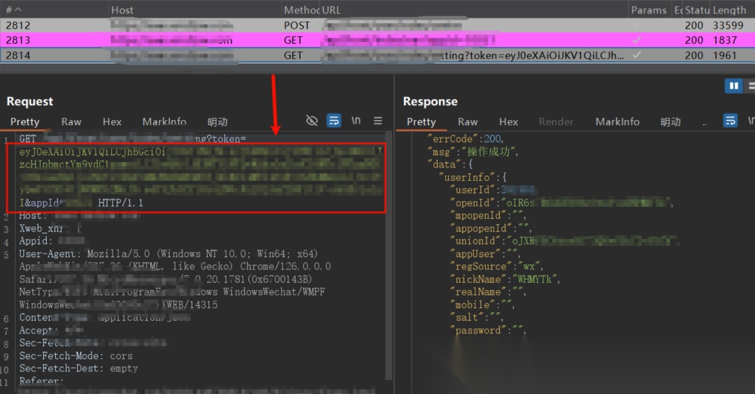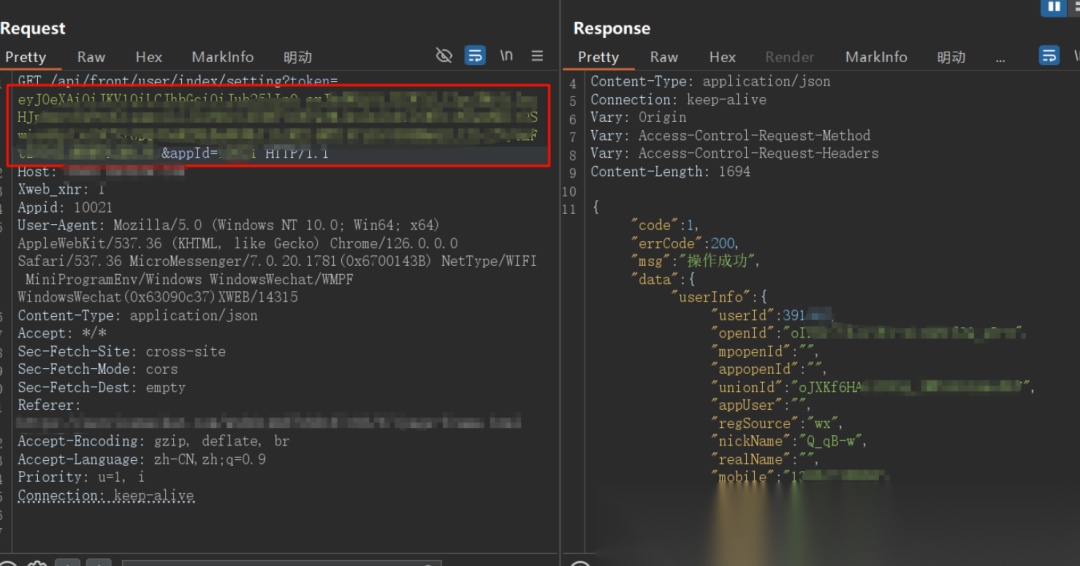 登录一波小程序,接着查看下个人信息,看有无id参数越权查询。