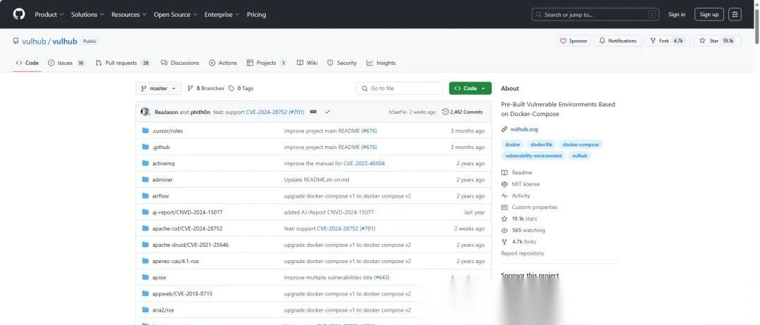 Vulhub 是一个开源的漏洞靶场平台,它借助 Docker 和 Docker-Compose 技术,预置了多种漏洞环境。用户能够快速启动并进行漏洞实验,非常适合中高级安全研究者和学习者用于漏洞复现与深度探索。