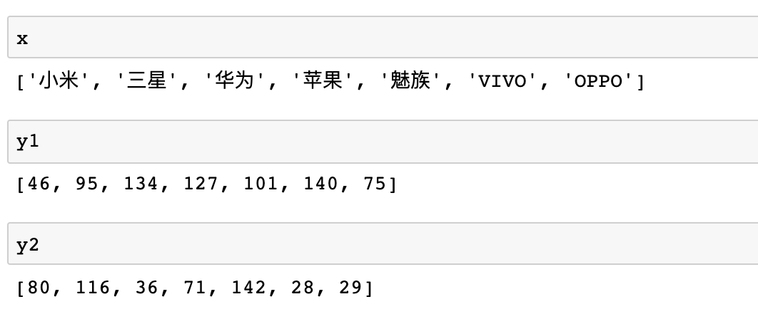 x 为一列品牌名称,y1/y2 为一列相同长度的无意义数据,接下来让我们使用不同的库对这组数据进行可视化!