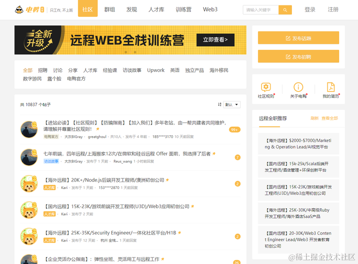 电鸭社区是具有8年历史的远程工作招聘社区,也是远程办公互联网工作者们的聚集地。在社区,我们进行有价值的话题讨论,也分享远程、外包、零活、兼职、驻场等非主流工作机会。