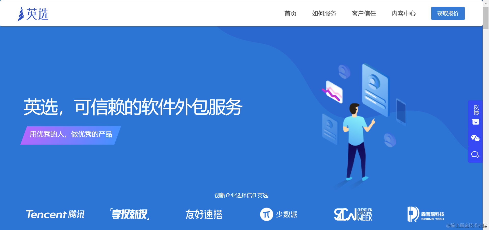 英选平台上所有的项目均采用“项目经理模式”,在项目需求方和技术供给方之间提供全方位沟通和项目跟踪服务,比较省心。英选也服务过不少知名客户,包括腾讯、德勤咨询、海康威视等等。