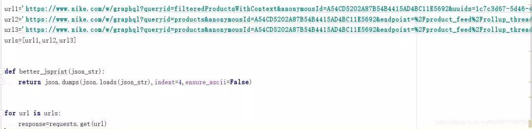 import requestsimport json''''''#刚刚在调试台得到的地址url='https://www.nike.com/w/graphql?queryid=filteredProductsWithContext&anonymousId=A54CD5202A87B54B4415AD4BC11E5692&uuids=1c7c3d67-5d46-432d-9910-b1128d1b6503,e09eabe9-5ff0-42af-b0a3-5f68af19d89a&language=zh-Hans&country=CN&sortBy=priceAsc'#使json数据格式化输出更好观察def better_jsprint(json_obj): # 使用indent=4 这个参数对json进行数据格式化输出 #因为json.dumps 序列化时对中文默认使用的ascii编码.想输出真正的中文需要指定ensure_ascii=False return json.dumps(json.loads(json_obj),indent=4,ensure_ascii=False)response=requests.get(url)print(better_jsprint(response.text))