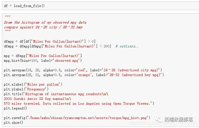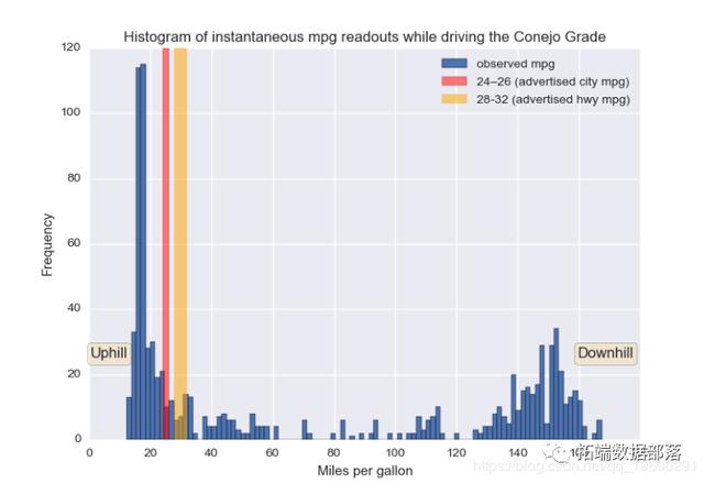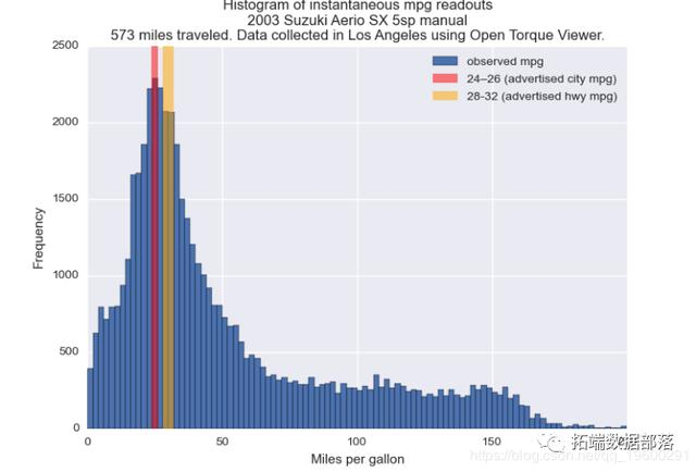 扭矩可在驾驶时提供瞬时mpg数据的读数。 我对该数据进行了直方图处理,并将其与下表中的广告值进行了比较。