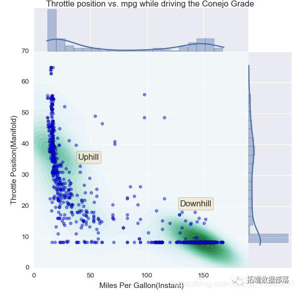 我在上坡地区的平均油耗为17.77 mpg,下坡时的平均油耗为112.92。 这是Conejo成绩记录的瞬时mpg测量值的直方图: