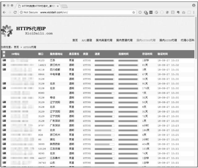 在代理的种类上,HTTP 代理多,HTTPS 代理较少。在互联网倡导 HTTPS 的 趋势下,单纯使用 HTTP 代理是无法访问 HTTPS 网址的。大部分往往网站会同时保留 HTTPS 和 HTTP 的访问,所以可以试着将 HTTPS 网址改为 HTTP(协议),一个 原则是,如果网站的 HTTP 可以用,则不要使用 HTTPS。原因是 HTTPS 需要多次握 手,速度比较慢,经过代理之后会显得更慢。HTTP 则会快很多,而且代理服务器可选资源较多,HTTP 代理列表如图 1-5 所示,HTTPS 代理列表如图 1-6 所示。