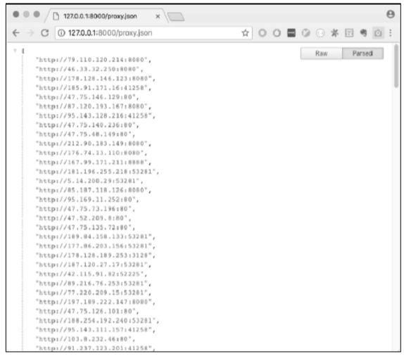 在一个终端中运行python3 proxy-pool-gather.py后可以看到代理已经开始抓取工 作。在另一个终端中运行 python3 proxy-http-server.py,访问 http://localhost:8000/proxy.json 会返回代理列表,如图 1-7 所示。