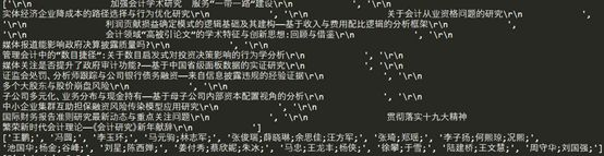 现在我们就成功使用Python得到了《会计研究》2018年12期期刊的文章题目和对应作者,达到了迅速浏览目录的效果。