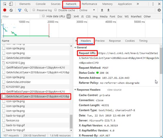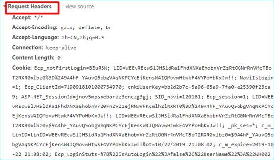import requests #引入requests库爬取网页代码import json #引入json库处理data列表中的内容 url='https://navi.cnki.net/knavi/JournalDetail/GetArticleList?year=2018&issue=01&pykm=KJYJ&pageIdx=0&pcode=CJFD' headers={ 'Accept': '*/*', 'Accept-Encoding':'gzip, deflate, br', 'Accept-Language':'zh-CN,zh;q=0.9', 'Connection':'keep-alive', 'Content-Length':'0', 'Cookie':'Ecp_notFirstLogin=lGQkVH; Ecp_ClientId=7190918101000734970;cnkiUserKey=bb2d2b7c-5a96-65a9-7fa0-e25390f23ca9;LID=WEEvREcwSlJHSldRa1FhdXNXaEhobnVrZ0FnZVZzejRNWVFKcmlhZlNXRT0=$9A4hF_YAuvQ5obgVAqNKPCYcEjKensW4IQMovwHtwkF4VYPoHbKxJw!!;ASP.NET_SessionId=jnov5mpsxebarzz3enczg3gj; SID_navi=120161;c_m_LinID=LinID=WEEvREcwSlJHSldRa1FhdXNXaEhobnVrZ0FnZVZzejRNWVFKcmlhZlNXRT0=$9A4hF_YAuvQ5obgVAqNKPCYcEjKensW4IQMovwHtwkF4VYPoHbKxJw!!&ot=10/22/201919:34:18; c_m_expire=2019-10-22 19:34:18; Ecp_session=1; Ecp_LoginStuts=%7B%22IsAutoLogin%22%3Afalse%2C%22UserName%22%3A%22WH0023%22%2C%22ShowName%22%3A%22%25E4%25B8%25AD%25E5%258D%2597%25E8%25B4%25A2%25E7%25BB%258F%25E6%2594%25BF%25E6%25B3%2595%25E5%25A4%25A7%25E5%25AD%25A6%22%2C%22UserType%22%3A%22bk%22%2C%22r%22%3A%22lGQkVH%22%7D;Ecp_notFirstLogin=lGQkVH;LID=WEEvREcwSlJHSldRa1FhdXNXaEhobnVrZ0FnZVZzejRNWVFKcmlhZlNXRT0%3D%249A4hF_YAuvQ5obgVAqNKPCYcEjKensW4IQMovwHtwkF4VYPoHbKxJw!!;NaviIsLogin=1; _pk_ses=*', 'Host':'navi.cnki.net', 'Origin':'https://navi.cnki.net', 'Referer':'https://navi.cnki.net/knavi/JournalDetail?pcode=CJFD&pykm=KJYJ', 'Sec-Fetch-Mode':'cors', 'Sec-Fetch-Site':'same-origin', 'User-Agent':'Mozilla/5.0 (Windows NT 10.0; Win64; x64) AppleWebKit/537.36 (KHTML, likeGecko) Chrome/75.0.3770.100 Safari/537.36', 'X-Requested-With':'XMLHttpRequest' }data={ 'year': '2018', 'issue': '01', 'pykm': 'KJYJ', 'pageIdx': '0', 'pcode': 'CJFD' }html=requests.post(url,headers=headers,data=json.dumps(data))