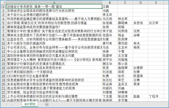 with open('g:\\会计研究.csv','w',encoding='gb18030') as f: for i in range(0,len(toauthor)): f.write(totitlename[i].strip()+','+re.sub(";",",",toauthor[i])+'\n') #strip函数把文章题目中的空白字符删掉,re.sub把作者中的分号替换为逗号。写入文章题目+作者姓名