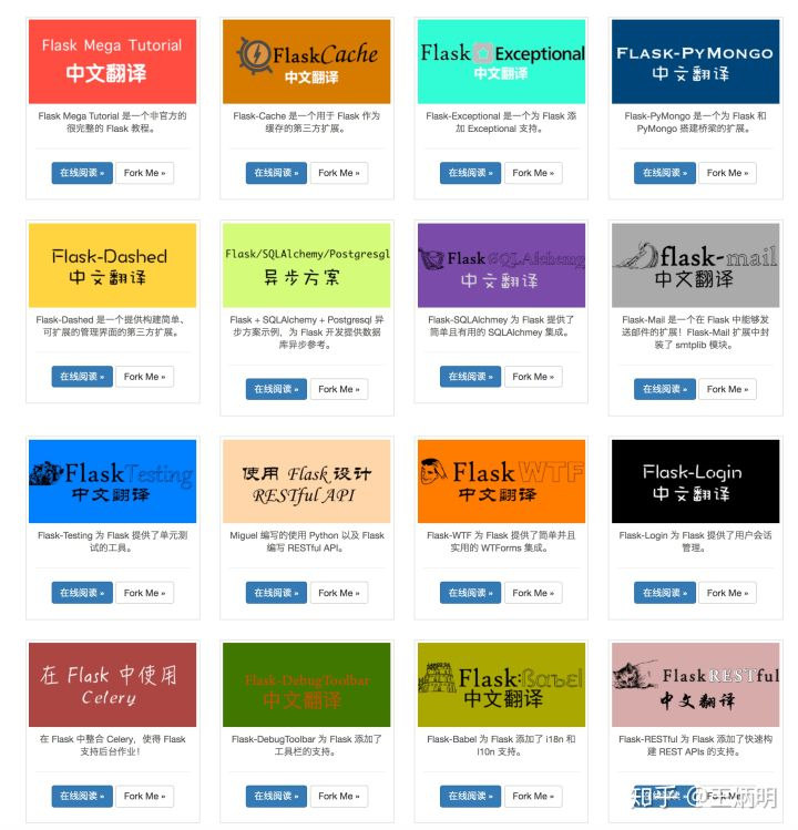 Flask 的使用非常灵活,在这里推荐一个网站 ,收录了很多关于 Flask 的解决文案,而且都是全中文的。