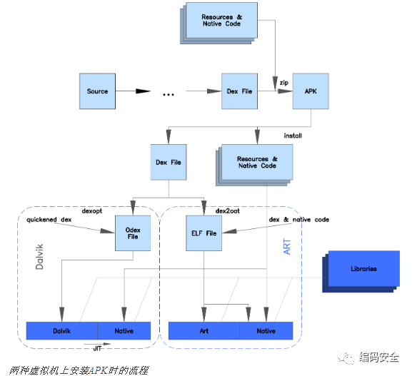 AOT编译是在应用程序安装时就进行的工作,下图描述了Dalvik虚拟机与(Android 5.0上的)ART虚拟机在安装APK时的区别: