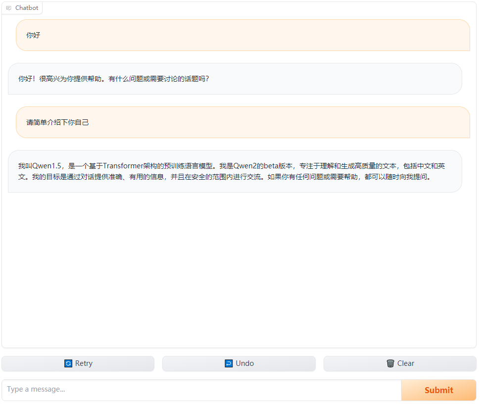from openai import OpenAI``client = OpenAI(` `api_key="Qwen1.5-14B-Chat-GPTQ-Int4", # 不能不设置,也不能为空` `base_url="http://127.0.0.1:7777/v1" # 注意,这里是base_url,不是具体chat接口的地址``)`` ``system_prompt = "你是 Qwen1.5, Qwen1.5 is the beta version of Qwen2, a transformer-based decoder-only language model pretrained on a large amount of data. 你擅长中文和英文的对话。你会为用户提供安全,有帮助,准确的回答。"`` ``def predict(message, history):` `history_openai_format = [` `{"role": "system", "content": system_prompt}` `]` `for human, assistant in history:` `history_openai_format.append({"role": "user", "content": human })` `history_openai_format.append({"role": "assistant", "content":assistant})` `history_openai_format.append({"role": "user", "content": message})`` ` `response = client.chat.completions.create(` `model="Qwen1.5-14B-Chat-GPTQ-Int4",` `messages=history_openai_format,` `temperature=0.3)`` ` `return response.choices[0].message.content`` `` ``import gradio as gr`` ``gr.ChatInterface(predict, chatbot=gr.Chatbot(height=700)).launch(server_name='0.0.0.0', server_port=9999)