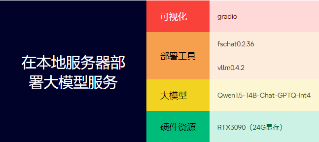 上图是本文相关的技术内容,可以通过一段话的总结来理解它们的关系:使用了一张RTX3090的显卡,有24GB显存,使用的大模型是Qwen1.5-14B-Chat-GPTQ-Int4,在部署上使用了vllm提升大模型的性能,使用fschat将大模型部署成服务,并基于gradio创建了一个可视化的聊天窗口。