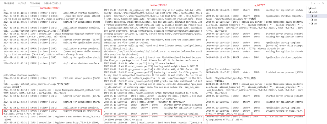 nohup python -u -m fastchat.serve.controller --host='0.0.0.0' \``--port=21001 > ./logs/fastchat_serve_controller.log 2>&1 &``echo 'start controller'`` ``nohup python -m fastchat.serve.vllm_worker --model-path \``~/LLM/Qwen1.5-14B-Chat-GPTQ-Int4 \``--controller-address http://0.0.0.0:21001 \``--port 19000 --host 0.0.0.0 --num-gpus 1 \``--worker-address http://0.0.0.0:19000 \``--gpu-memory-utilization 0.8 --max-model-len 5696 \``--trust-remote-code \``> ./logs/Qwen1.5-14B-Chat-GPTQ-Int4.log 2>&1 &``echo 'start worker'`` ``nohup python -u -m fastchat.serve.openai_api_server \``--host 0.0.0.0 --port 7777 \``--controller-address http://0.0.0.0:21001 \``> ./logs/fastchat_api.log 2>&1 &``echo 'start api'