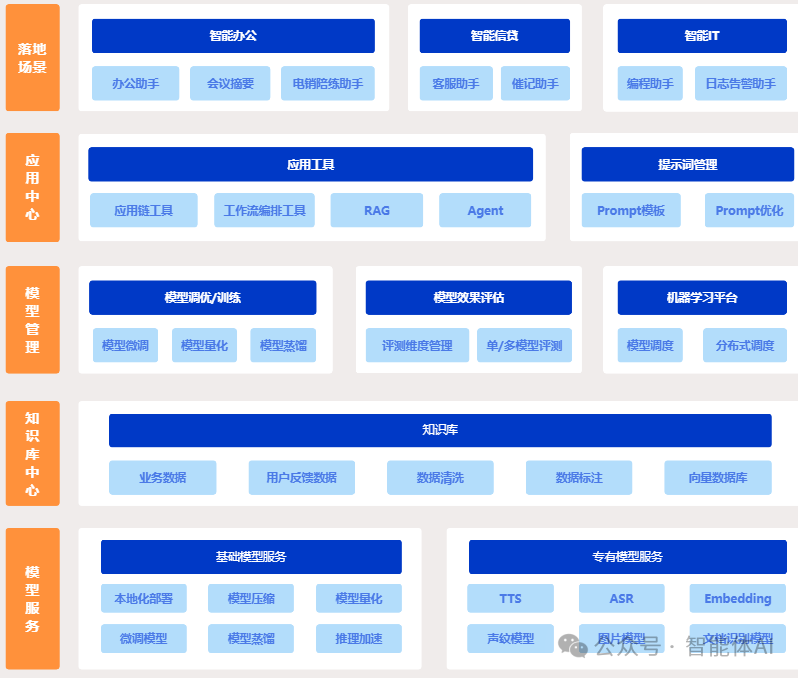 大模型的实际价值首先体现在各个业务场景的落地应用中。在架构图的落地场景模块中,主要展示了大模型在智能办公、智能客服和智能IT等领域的应用。