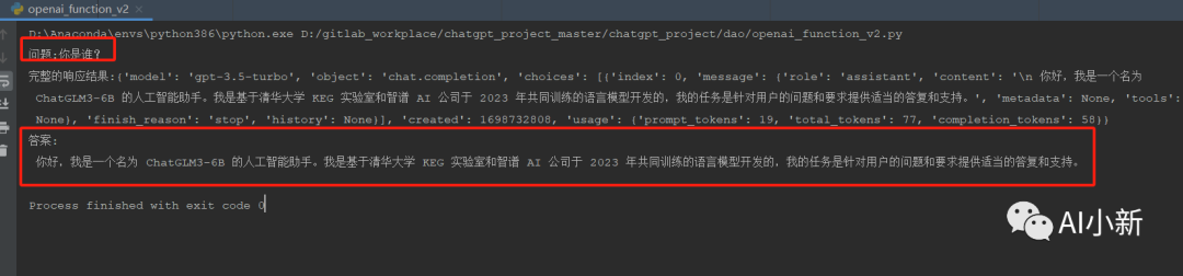#!/usr/bin/env python``# -*- coding: UTF-8 -*-``"""``@Project :chatgpt``@File :openai_function.py``@Author :aixiaoxin``@Date :2023/10/27 17:28``"""``import requests`` ``def request_chatgpt_function():` `# 通用方法:利用requests 请求调用` `question = "你是谁?"` `openai_url="http://ip:8000/v1/chat/completions" # 可以替换为任何代理的接口,官网地址 https://api.openai.com/v1/chat/completions` `OPENAI_API_KEY="sk-amd6pTaiXrJ6U8VjFb7dB439A97542D5A2E4Ed38C1BaC9D2" # openai的key,此处不需要填写` `header={"Content-Type": "application/json","Authorization": "Bearer " +OPENAI_API_KEY}` `data={` `"model": "gpt-3.5-turbo",` `"messages": [` `{` `"role": "system",` `"content": "You are a helpful assistant."` `},` `{` `"role": "user",` `"content": question` `}` `],` `"stream":False` `}` `print("问题:{}".format(question))` `response=requests.post(url=openai_url,headers=header,json=data).json()` `print("完整的响应结果:{}".format(response))` `answer = response["choices"][0]["message"]["content"]` `print("答案:{}".format(answer))`` `` `` ``if __name__ == "__main__":` `request_chatgpt_function() # 通用方法:利用requests 请求调用