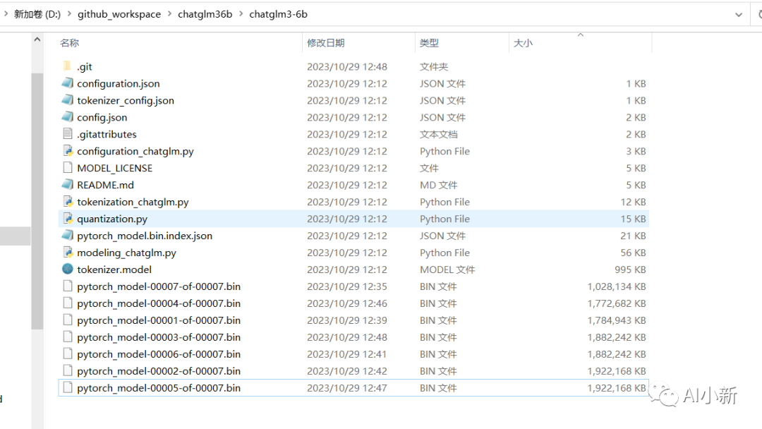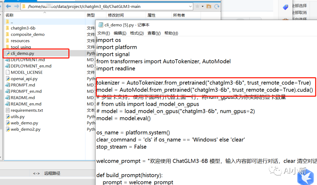 本文将模型文件放在代码的同级目录,所以修改下cli_demo.py 中 模型文件存放的位置,填入 模型文件所在的 相对路径或者绝对路径。