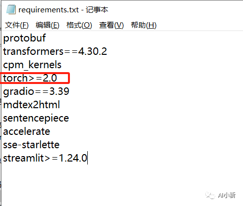 作者的torch版本为1.13.1,所以删除掉 requirements.txt 中的红框部分,如果你的torch大于2.0 ,则不需要删除这一行。