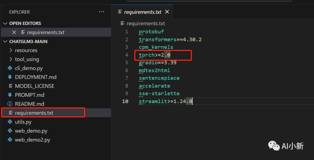 3.1 首先看到requirements.txt,可以看到官网推荐的torch版本>=2.0,但是当torch==1.13.1时也可以运行,看你们自己的选择。