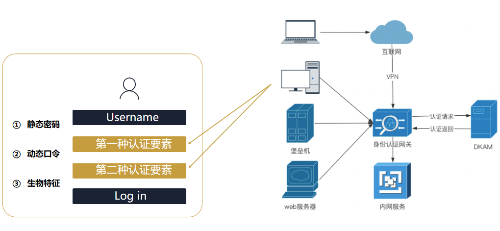 **动态令牌口令:**动态令牌激活令牌种子,生成动态口令;每一个令牌都有自己的序列号,令牌序列号与用户身份绑定。当用户登录认证时,输入账号和动态令牌口令并将其提交至认证服务器,认证服务器将其与服务器内动态口令对比,完成整个认证过程。