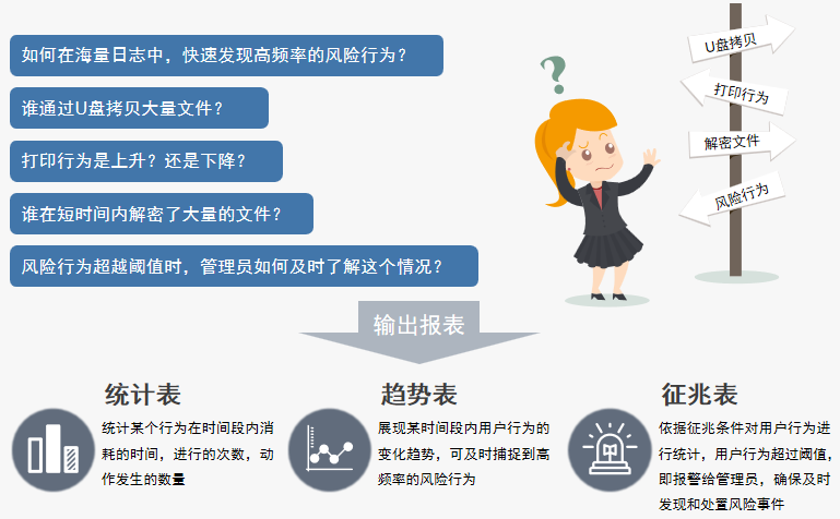 IP-guard一体化终端安全管理系统的各项管控功能都配套完善的日志记录,IP-guard风险审计报表则负责对这些日志记录进行系统分析,通过统计表、趋势表、征兆表等不同维度展现各类活动的变化趋势,让企业客户可以快速掌控内网的动态。