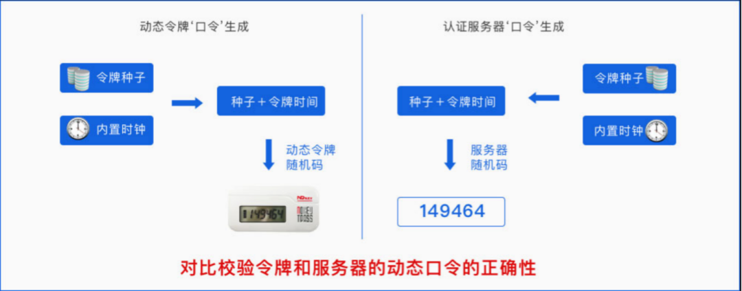 **认证服务器动态口令:**认证服务器存储令牌种子,与用户账号绑定后,服务器内生成该用户可用的“动态口令”;