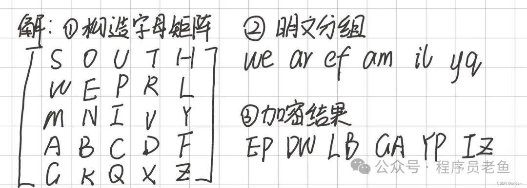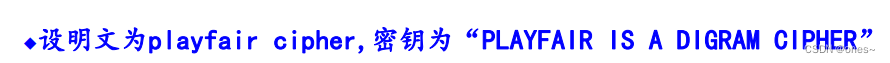 **Playfair密码:**将明文中的双字母组合成一个单元,并将这些单元替换为密文双字母组合.替换基于一个5*5的矩阵,该矩阵使用一个密钥(关键词,或一段话)来构造