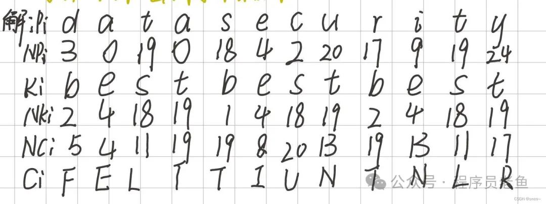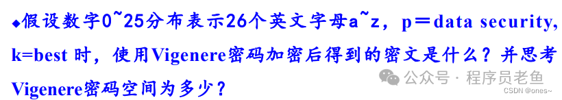 **Vigenere密码:**选择词组作为密钥,第一个密钥字母加密明文的第一个字母,第二个密钥加密明文的第二个字母,等所有密钥字母使用完后,密钥再次循环使用。例题如下: