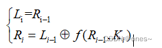 2.乘积变换(16轮迭代):将初始置换得到的64位结果分为两半,记为L0和R0,各32位。设初始密钥为64位,经密钥扩展算法产生16个48位的子密钥,记为K1,K2,…,K16,每轮迭的逻辑关系为:
