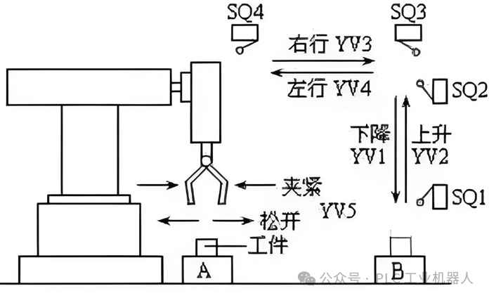 机械手功能为一个将工件由A处传送到B处﹐上升下降和左移/右移的执行用双线圈二位电磁阀推动气缸完成。当某个电磁阀线圈通电﹐就一直保持现有的机械动作。例如一旦下降的电磁阀线圈通电﹐机械手下降﹐即使线圈再断电,仍保持现有的下降动作状态直到相反方向的线圈通电为止。夹紧/放松由电磁阀推动气缸完成,线圈通电执行夹紧动作,线圈断电时执行放松动作。设备装有上、下限位和左、右限位开关: