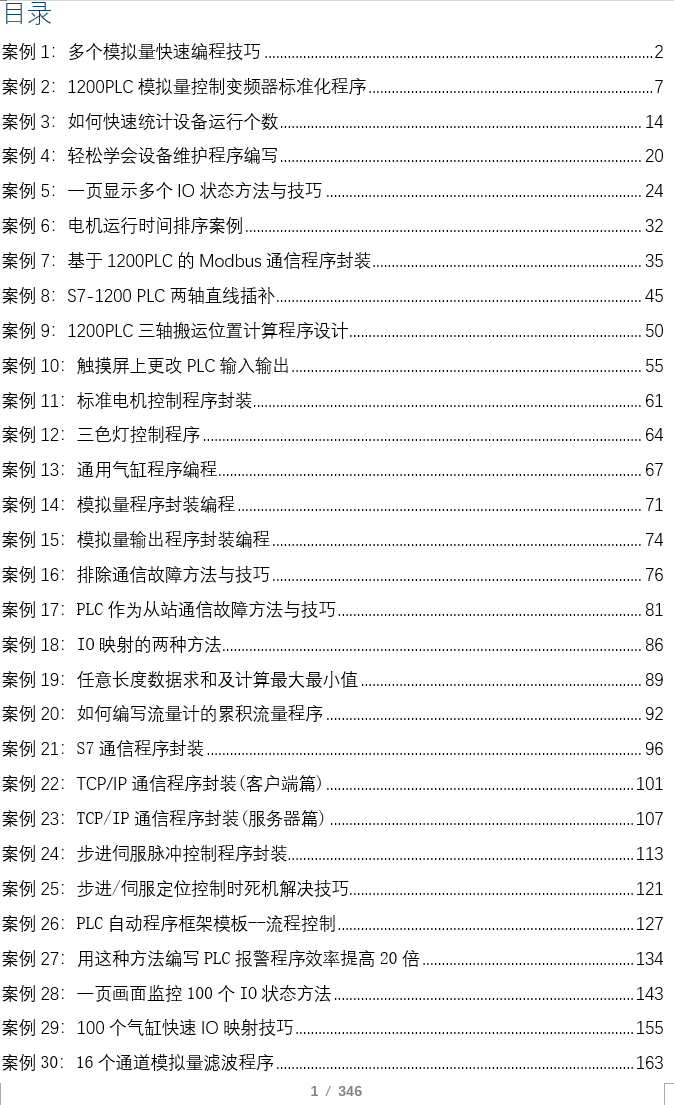 最近有很多小伙伴说要案例书籍,说是手机上看文章不是很方便,我抽时间把55个实战案例全部整理出来,案例都是比较典型的,其中包括气缸控制程序、报警程序、程序框架、运动控制程序封装、模拟量控制变频器、通信等实战案例。需要的可以加我微信:biao467524527,如果加不上可以私信我!