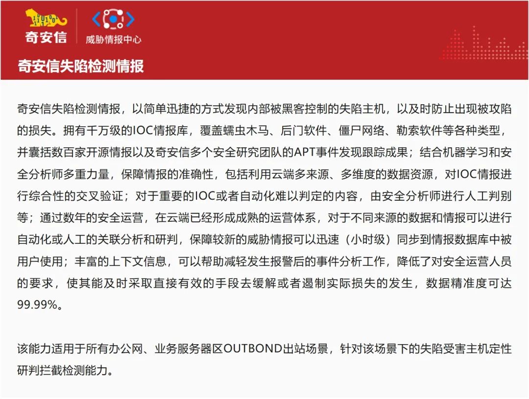 奇安信情报不仅数量级更大(千万级IOC),还结合了APT追踪成果、人工分析和多源验证,准确率可达99.99%,远超普通开源情报。