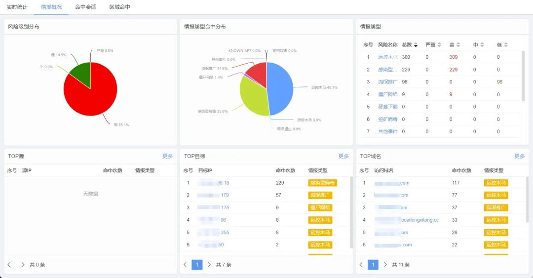 包含13类情报规则,数据全面:恶意下载,挖矿病毒,其他事件,KNOWN APT,流氓推广,僵尸网络,黑市工具,感染型病毒,勒索病毒,网络蠕虫,窃密木马,远控木马,定向攻击等。