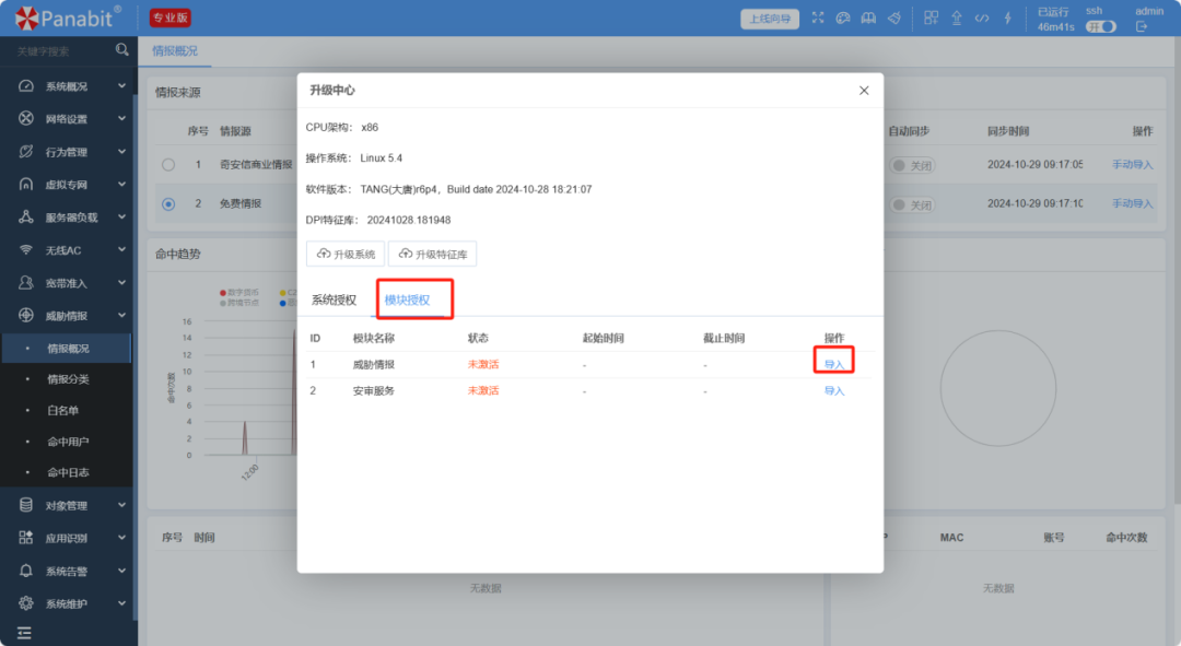 设备支持在线自动更新。如果管理口无法连接外网,您可以通过手动导入的方式更新,情报库可联系派网官方工作人员获取。