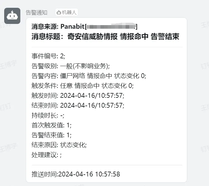 命中情报自动推送告警,及时提醒用户注意网络安全事件。