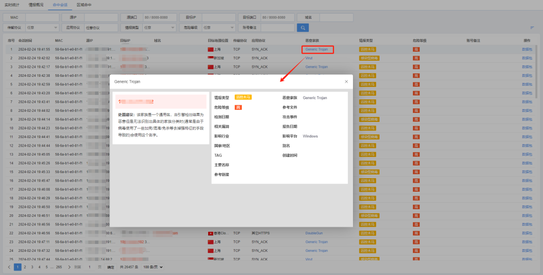 详细分析命中会话,并提供原始数据包进行深入分析。