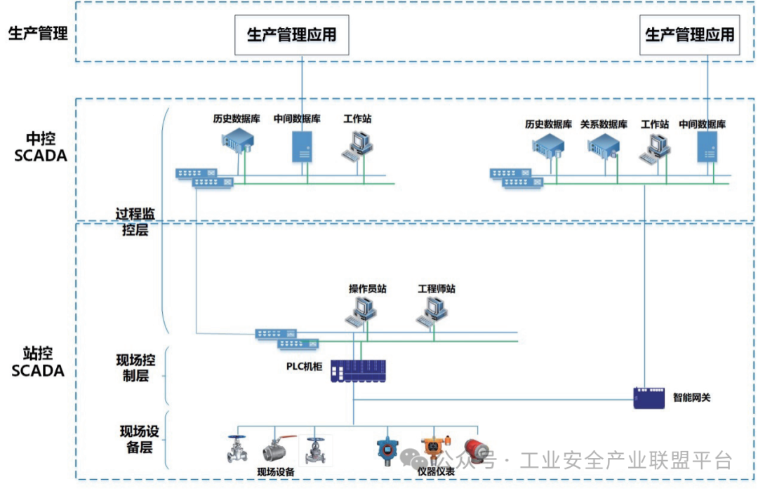 随着数字化转型的发展和推动,油气管道企业通过新建生产调控中心,采集所属站场的生产数据,实现调度日常运行、设备远程诊断与维护、综合报警等管理功能,为生产运行、设备维护管理、生产决策等提供了有效支持,快速提升了生产效率。长输油气管道SCADA系统一般可分为SCADA中控系统和SCADA站控系统:SCADA中控系统作为生产调控中心实现下辖站场、阀室的管理,其主要由SCADA数据库和工作站组成,并将相关业务传送到生产管理系统中;SCADA站控系统负责站场及阀室内工艺过程的数据采集和监控。按照工业控制系统网络层次油气管道SCADA系统可分为过程监控层、现场控制层、现场设备层,其架构如图1所示。