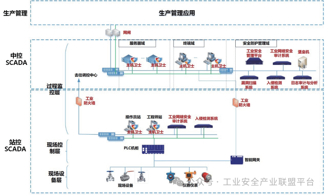(2)安全区域边界方面,对工业控制网络内部各安全域之间以及工业控制网络与非工业控制网络之间的数据访问进行控制;对工业控制网络流量进行监测审计,对工业控制网络中的网络攻击、病毒等安全事件进行检测,及时发现工业控制网络中的威胁信息。