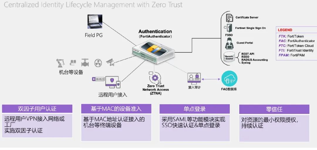 FortiAuthenticator通过统一身份验证,确保每个用户的身份经过强验证,支持单点登录(SSO)、多因子认证(MFA)等功能,有效防止凭据滥用。